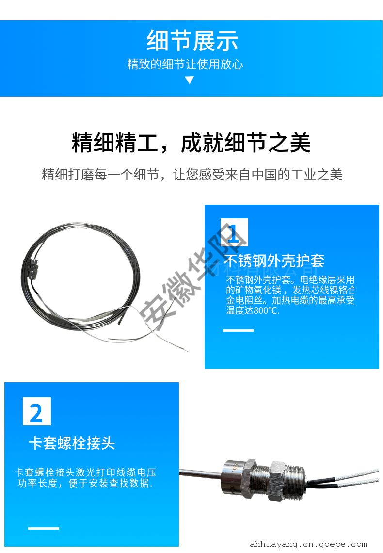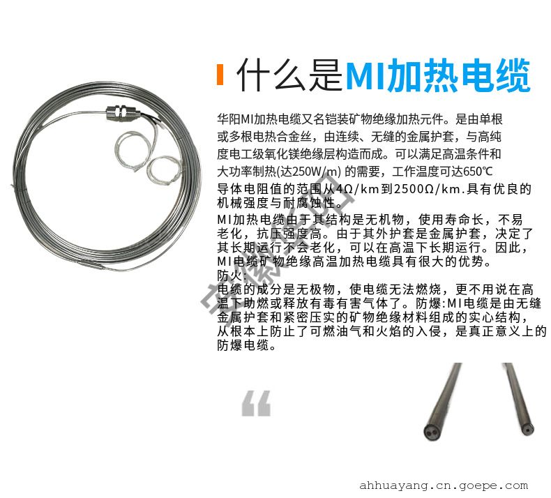 -     详细信息安徽合肥华阳单芯ABMI-G1/2-220/70矿物绝缘MI加热电缆 一、安徽合肥华阳单芯矿物绝缘(MI)加热电缆简介 安徽华阳单芯矿物绝缘(MI)加热电缆不锈钢护套系列矿物绝缘加热电缆可以满足高温条件和大发热功率(达269W/m)的需要。不锈钢护套加热电缆的*高承受温度可达600℃;导体电阻值的范围从2.1Ω/km到36100Ω/km;矿物绝缘电缆具有优良的机械强度,耐腐蚀。 二、安徽华阳单芯矿物绝缘(MI)加热电缆参数 1. 外壳:不锈钢或铜 2. 绝缘层:矿物氧化镁 3. 发热芯线:镍铬合金丝(2080) 4. 功率设计:50W-150W/M 5. 使用电压:24V、36V、110V、220V、380V等 6. 单支长度:3M-120M 7. 伴热温度:-50℃-300℃ 8. 承受温度:<800℃ 9. 弯曲半径:电缆直径的4倍 三、安徽华阳单芯矿物绝缘(MI)加热电缆应用 核工业:建筑业——沥青加热 金属制造工业:低熔点合金熔解——罐桶/容器加热 挤塑机螺筒加热:高温工业管道伴热 工艺介质防凝降粘:各类工业电加热器