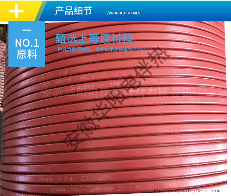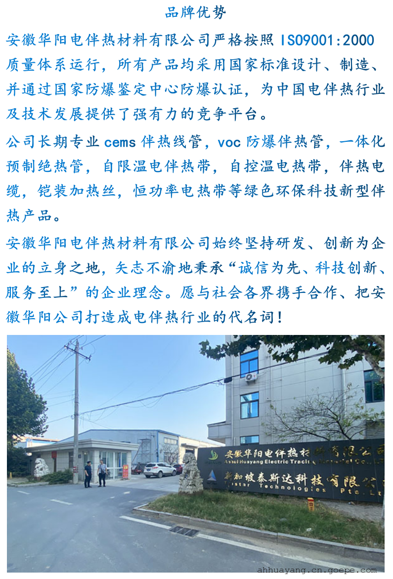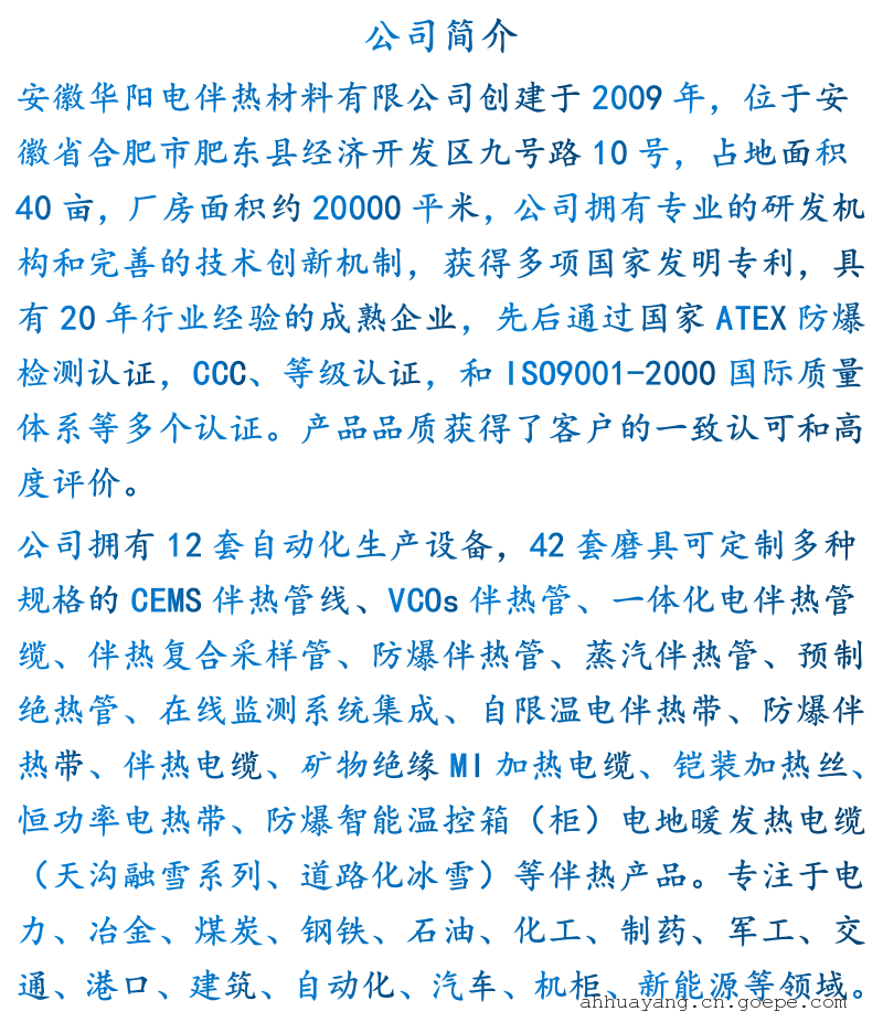 -     详细信息华阳自控温电伴热带中温自限温防爆阻燃电热带26LEP2T—CT 安徽华阳电伴热材料有限公司自主研制、开发的自限温电伴热带(温控伴热电缆、自调温电热带)自限温电伴热带广泛应用于石油、化工、钢铁、电力等工业 企业的管线、储罐的保温、抗凝、防冻。该电缆适用于普通区、危险区和腐蚀区。 一、电伴热带技术指标 1、工作电压:220V; 2、功率:35W/m 、40W/m、45W/m、50W/m、60W/m; 3、启动电流:≤0.8A; 4、使用长度:100M;超过使用长度容易产生电压降,电流大,加速使用寿命受限,衰竭 5、标准颜色:棕色. 6、温度范围:维持温度105℃;表面温度:105℃±5℃;承受温度:改良性聚烯烃135℃ 7、施工温度:-60℃; 8、热稳定性:由10℃至99℃间来回循环300次后,电热带发热量维持在90%以上; 9、弯曲半径:20℃室温时为25.4mm;-30℃低温时为35.0mm; 10、护套层:改良性聚烯烃、阻燃聚烯烃 二、应用场合: 26LEP2T—CT中温温自限温电伴热带具有阻燃防爆型,适用于消防、化工厂、电厂等需要防冻保温的场所。 三、使用注意事项: 1、严禁电伴热带暴露在保温层外,否则将增大能耗,降低使用寿命。 2、电伴热带首端接电源线,首、尾端封头要做好防水处理。 3、在环境温度接近零度时,即接通电伴热带控制开关,使其生产温度,防止进出水管冻堵。 4、伴热带应安装漏电保护开关,应在干燥状态下工作。