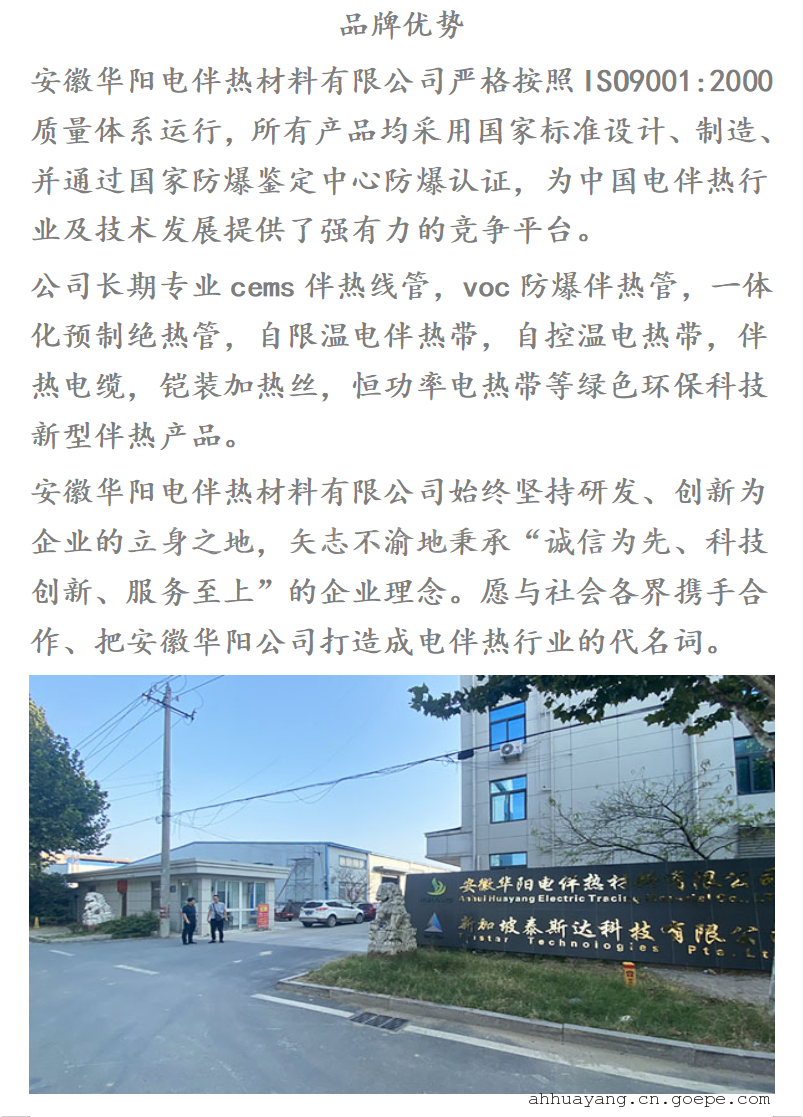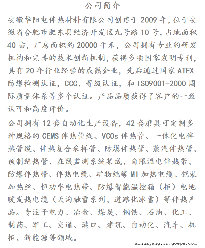 -     详细信息华阳自限温电热带防爆防腐电伴热电缆DXW-PF-J3-45 30W 220V 安徽华阳电伴热材料有限公司自主研制、开发的华阳自限温电热带防爆防腐电伴热电缆DXW-PF-J3-45 30W 220V(温控伴热电缆、自调温电热带)广泛应用于石油、化工、钢铁、电力等工业 企业的管线、储罐的保温、抗凝、防冻。该电缆适用于普通区、危险区和腐蚀区。 一、华阳自限温电热带防爆防腐电伴热电缆DXW-PF-J3-45 30W 220V技术指标 1、工作电压:220V; 2、*大功率:30W/m; 3、启动电流:≤0.6A; 4、*大使用长度:100M;超过使用长度容易产生电压降,电流大,加速使用寿命受限,衰竭 5、标准颜色:黑色. 6、温度范围:*高维持温度70℃;*高表面温度:70℃±5℃;*高承受温度:改良性聚烯烃105℃ 7、施工温度:*低:-60℃; 8、热稳定性:由10℃至99℃间来回循环300次后,电热带发热量维持在90%以上; 9、弯曲半径:20℃室温时为25.4mm;-30℃低温时为35.0mm; 10、护套层:改良性聚烯烃、阻燃聚烯烃 二、华阳自限温电热带防爆防腐电伴热电缆DXW-PF-J3-45 30W 220V应用场合 DXW-PF-J3-45 30W 220V低温自限温电伴热带除了具有普通型伴热带的性能外,还具有防爆、防腐的性能。“防爆”指在基本型自限温伴热带外,加上一层金属丝编织形成屏蔽层,具有接地和增强保护作用,适用于防爆需求的场所。“防腐”在屏蔽层上再加一层氟塑料外护套(即:46),达到耐腐的需求。。适用于化学、电厂等需要防腐性能的场所。 三、华阳自限温电热带防爆防腐电伴热电缆DXW-PF-J3-45 30W 220V使用注意事项 1、严禁电伴热带暴露在保温层外,否则将增大能耗,降低使用寿命。 2、电伴热带首端接电源线,首、尾端封头要做好防水处理。 3、在环境温度接近零度时,即接通电伴热带控制开关,使其生产温度,防止进出水管冻堵。 4、伴热带应安装漏电保护开关,应在干燥状态下工作。