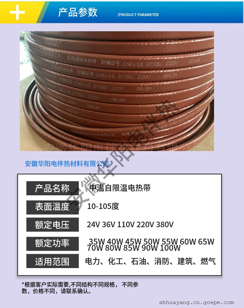 -     详细信息华阳销售工业电热带中温防爆电伴热带WLZRZBR-35-P-220 安徽华阳工业电热带中温防爆电伴热带WLZRZBR-35-P-220(温控伴热电缆、自调温电热带)广泛应用于石油、化工、钢铁、电力等工业 企业的管线、储罐的保温、抗凝、防冻。该电缆适用于普通区、危险区和腐蚀区。 一、华阳工业电热带中温防爆电伴热带WLZRZBR-35-P-220技术指标 1、工作电压:220V; 2、功率:35W/m ; 3、启动电流:≤0.8A; 4、使用长度:100M;超过使用长度容易产生电压降,电流大,加速使用寿命受限,衰竭 5、标准颜色:棕色. 6、温度范围:维持温度105℃;表面温度:105℃±5℃;承受温度:改良性聚烯烃135℃ 7、施工温度:-60℃; 8、热稳定性:由10℃至99℃间来回循环300次后,电热带发热量维持在90%以上; 9、弯曲半径:20℃室温时为25.4mm;-30℃低温时为35.0mm; 10、护套层:改良性聚烯烃、阻燃聚烯烃 二、华阳工业电热带中温防爆电伴热带WLZRZBR-35-P-220应用场合 WLZRZBR-35-P-220(WET)中温自限温电伴热带具有阻燃防爆型,适用于消防、化工厂、电厂等需要防冻保温的场所。 三、华阳工业电热带中温防爆电伴热带WLZRZBR-35-P-220使用注意事项 1、严禁电伴热带暴露在保温层外,否则将增大能耗,降低使用寿命。 2、电伴热带首端接电源线,首、尾端封头要做好防水处理。 3、在环境温度接近零度时,即接通电伴热带控制开关,使其生产温度,防止进出水管冻堵。 4、伴热带应安装漏电保护开关,应在干燥状态下工作。