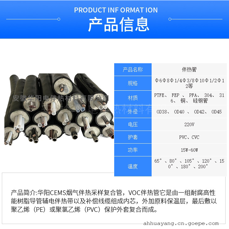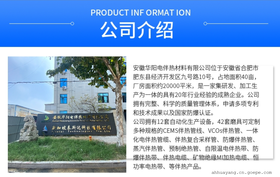 -     详细信息华阳销售/CEMS伴热取样管CEI-2-2-8/双管采样管/安全环保 一、什么Cems伴热取样管? Cems伴热取样管是一种用于大气污染控制的重要实验设备。该设备主要由伴热取样管和伴热采样器组成,可以对大气中的污染物进行采样和分析。伴热取样管的主要作用是在采样时,避免样品流失和损失,以及保持样品在恒温和恒流的状态下,以便进行后续的分析。它的优点是使用范围广,能够对显性和微小样品进行分析研究。因此,在环境监测、化学工业和医药研究等领域,伴热取样管被广泛应用。 伴热采样器是伴热取样管的主要组成部分,具有精度高、结构简单、操作方便等优点。伴热采样器通过加热、冷却和恒温的方式,可以使样品在不同的温度下保持稳定的状态。在采样过程中,伴热采样器还可以通过自动调节温度,避免污染物的气态成份在采样过程中的损失和转化。 安徽华阳cems伴热取样管(耐腐伴热采样复合管),是我公司自主研制成功,主要应于电厂脱硫、脱硝,烟气在线监测各种排放气体的取样、分析等。我公司的烟气监测分析管分为低温型、高温型等两种类型,现已广泛应用于航天航空、石油化工、冶金电力、医药、造纸等行业的工业过程自动控制系统中。我公司的产品先后被多家环保企业选用。并完全成功地替代了国外进口。 在烟气、废气连续监测系统中,除分析仪器、计算机以外,采样部分是起始基础的关键部件。 cems烟气伴热取样管线中的取样导管可以选用不同的材质,如PFA、FEP、PTFE,316ss、硅钢管(美国进口)紫铜管。伴热带可以选用中、低、高温伴热带,另外还可以添加补偿导线、电源线等。 二、华阳CEMS伴热取样管CEI-2-2-8/双管采样管/安全环保技术参数 1、管线:材质PTFE;外径Φ8mm,双芯。 2、电伴热带:恒功率电热带、自限温电热带、高温加热丝。 3、采样气体加热温度:65℃;80℃;120℃;150℃;180℃以上。 4、伴热管线外径:OD42mm。 5、黑色PVC/CVC防磨层。 6、功率:15~60W/M。 7、供电电源:220VAC 50Hz 220v。 安装细则 1.电气指标 (1)额定电压:220VAC. (2)自限温管线加热长度100~120m. (3)自限温管线配备断路器,电流值30A. (4)伴热系统一个回路. 2.热工指标 (1)在-20℃环境温度,15m/s风速情况下,管内保持温度40~50℃。 (2)采样管可耐各种酸、碱介质腐蚀,耐压强度1.0Mpa不泄漏。 (3)采样管可在<200℃温度下长期工作。 3.安装指标 (1)复合管的曲率半径0.5m. (2)安装温度-20℃(在-30℃~-40℃时采取适当措施). (3)固定距离:垂直方向2m,水平方向4m. 三、华阳CEMS伴热取样管CEI-2-2-8/双管采样管/安全环保安装注意事项 施工时严禁扭曲及地面拖行,管头护套只允许在安装接点时拆开。 a.要将伴热带的尾端封闭好,防止伴热带两线芯短路,使伴热带烧毁。 b.伴热带的屏蔽层必须接地,以防引起触电事故。 c.接电源的一端要使用专用的中间接线盒或电源接线盒,避免事故隐患。 d.配电开关安装漏电保护器。 四、cems伴热管线是由多种器件组合而成的一个复合体,在有限的截面上组合了多个系统。 ◇采样系统:可组合多种类型、材质的采样管:Teflon PFA、FEP、PE、尼龙610、12、铜管、316SS、304SS等。 ◇热工系统:绝热、阻燃和质轻的保温层; 自动限温的伴热电缆或恒功率伴热电缆。 ◇电系统:可配备仪表信号电缆、补偿电缆和控制电缆满足仪表显示监控用。 ◇安全系统:适应不同的工艺条件,将各系统用铝箔或金属丝网屏蔽隔离,达到防火安全,防静电、电磁屏蔽的作用,有的加防水膜和增强阻燃、防紫外线的护套。多元系统的组合,集多功能于一体,使繁杂的工程简捷化。 对于远程工作和系统的远程诊断起到良好的保障作用。 伴热系统使管内气体不冷凝,保持在露点以上测量,故测量精度可以得到保证,为中央集中控制计算机化创造了条件。增强外护套可以防止交叉和因其它因素的损坏。