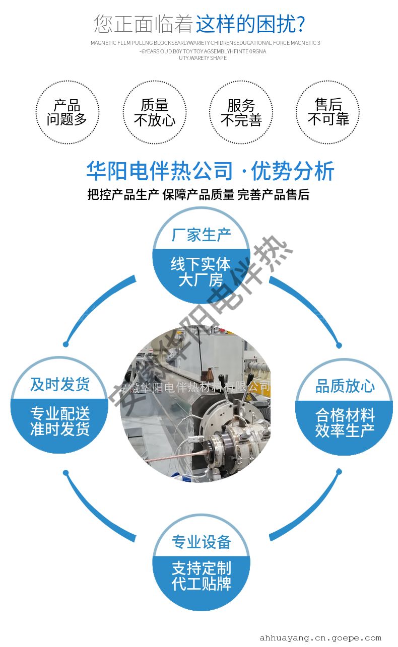 -     详细信息华阳耐腐蚀中温温控伴热电缆PTC工业专用电热带ZBR40-220-Q 安徽华阳电伴热材料有限公司自主研制、开发的自限温电伴热带(温控伴热电缆、自调温电热带)自限温电伴热带广泛应用于石油、化工、钢铁、电力等工业 企业的管线、储罐的保温、抗凝、防冻。该电缆适用于普通区、危险区和腐蚀区。 一、华阳耐腐蚀中温温控伴热电缆PTC工业专用电热带ZBR40-220-Q技术指标 1、工作电压:220V; 2、功率:35W/m 、40W/m、45W/m、50W/m、60W/m; 3、启动电流:≤0.8A; 4、使用长度:100M;超过使用长度容易产生电压降,电流大,加速使用寿命受限,衰竭 5、标准颜色:棕色. 6、温度范围:维持温度105℃;表面温度:105℃±5℃;承受温度:改良性聚烯烃135℃ 7、施工温度:-60℃; 8、热稳定性:由10℃至99℃间来回循环300次后,电热带发热量维持在90%以上; 9、弯曲半径:20℃室温时为25.4mm;-30℃低温时为35.0mm; 10、护套层:改良性聚烯烃、阻燃聚烯烃 二、华阳耐腐蚀中温温控伴热电缆PTC工业专用电热带ZBR40-220-Q应用场合 ZBR40-220-Q低温自限温电伴热带具有阻燃防爆型,适用于消防、化工厂、电厂等需要防冻保温的场所。 三、华阳耐腐蚀中温温控伴热电缆PTC工业专用电热带ZBR40-220-Q使用注意事项 1、严禁电伴热带暴露在保温层外,否则将增大能耗,降低使用寿命。 2、电伴热带首端接电源线,首、尾端封头要做好防水处理。 3、在环境温度接近零度时,即接通电伴热带控制开关,使其生产温度,防止进出水管冻堵。 4、伴热带应安装漏电保护开关,应在干燥状态下工作。