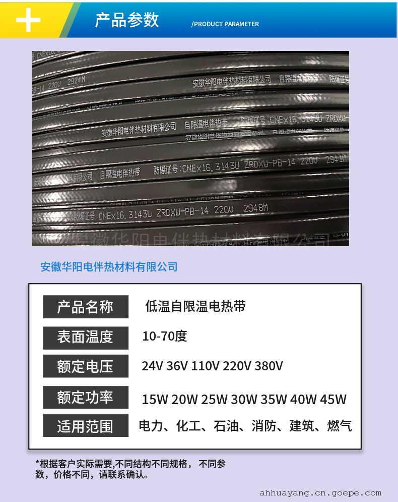-     详细信息华阳双阻燃防爆电力企业管道电伴热带/DBR-PZ-JZ-10W-220V 安徽华阳电伴热材料有限公司自主研制、开发的自限温电伴热带(温控伴热电缆、自调温电热带)广泛应用于石油、化工、钢铁、电力等工业 企业的管线、储罐的保温、抗凝、防冻。该电缆适用于普通区、危险区和腐蚀区。 一、华阳双阻燃防爆电力企业管道电伴热带/DBR-PZ-JZ-10W-220V技术指标 1、工作电压:220V; 2、功率:15W/m 、25W/m、30W/m、35W/m 3、启动电流:≤0.4A; 4、使用长度:100M;超过使用长度容易产生电压降,电流大,加速使用寿命受限,衰竭 5、标准颜色:棕色. 6、温度范围:维持温度70℃;表面温度:70℃±5℃;承受温度:改良性聚烯烃105℃ 7、施工温度:*低:-60℃; 8、热稳定性:由10℃至99℃间来回循环300次后,电热带发热量维持在90%以上; 9、弯曲半径:20℃室温时为25.4mm;-30℃低温时为35.0mm; 10、护套层:改良性聚烯烃、阻燃聚烯烃 二、华阳双阻燃防爆电力企业管道电伴热带/DBR-PZ-JZ-10W-220V应用场合: DBR-PZ-JZ-10W-220V低温自限温电伴热带具有阻燃防爆型,适用于消防、化工厂、电厂等需要防冻保温的场所。 三、华阳双阻燃防爆电力企业管道电伴热带/DBR-PZ-JZ-10W-220V使用注意事项: 1、严禁电伴热带暴露在保温层外,否则将增大能耗,降低使用寿命。 2、电伴热带首端接电源线,首、尾端封头要做好防水处理。 3、在环境温度接近零度时,即接通电伴热带控制开关,使其生产温度,防止进出水管冻堵。 4、伴热带应安装漏电保护开关,应在干燥状态下工作。