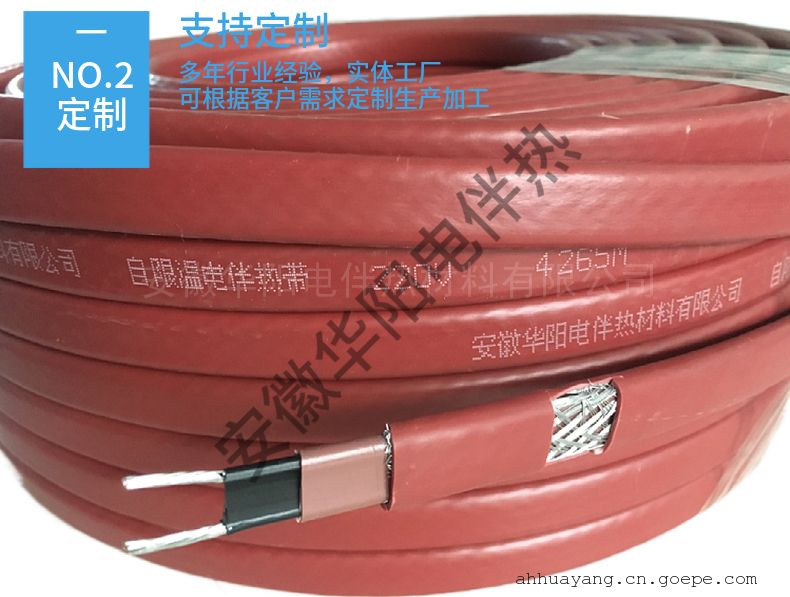 华阳阻燃防腐自控温伴热带功率40W工业电热带WLZBR-20-220-pF安徽华阳电伴热材料有限公司自主研制、开发的中温自限温电伴热带(温控伴热电缆、自调温电热带)广泛应用于电力、石油、化工、消防、天然气、医药、食品、建筑等工业企业的管线、储罐的伴热保温抗凝、防冻地板采暖、天沟融雪等领域。该电缆适用于普通区、危险区和腐蚀区。 产品型号:ZXW-J ZXW-P ZXW-F ZXW-PF ZXW-PF46 中温型:ZXW(ZBR、ZKW、ZBW、ZWK、ZHY、ZWL)相对应国外型号QTV系列 电缆结构: 1、铜芯导线:7×0.50、19×0.32、 2、导电塑料层:普通PTC、阻燃PTC、含氟PTC 3、绝缘层:改良性聚烯烃、阻燃聚烯烃、含氟聚烯烃、全氟材料 4、屏蔽层:镀锡软圆铜线,覆盖密度80% 5、护套层:改良性聚烯烃、阻燃聚烯烃、含氟聚烯烃、全氟材料 华阳阻燃防腐自控温伴热带WLZBR-20-220-pF标称功率40W工业电热带技术指标: 1、标准颜色:桔黄色、褐色 2、温度范围:维持温度105℃ | 表面温度105℃±5℃ | 承受温度135℃ 3、施工温度:*低:-30℃ 4、热稳定性:由10℃至149℃间来回循环300次后,电缆发热量维持在90%以上 5、弯曲半径:20℃室温时为25.4mm;-30℃低温时为35.0 mm 6、绝缘电阻:电缆长度100m,环境温度75℃时,用2,500VDC摇表摇试1分钟,绝缘电阻(导线与屏蔽间)*小值为3000MΩ 工作电压: 24V 36V 110V 220V 380V 10℃时输出功率:40W/m 防爆标志:ExeⅡT4 防爆合格证:证书号:CNEx11.0837X 华阳阻燃防腐自控温伴热带WLZBR-20-220-pF标称功率40W工业电热带产品优点: 1、伴热管线温度均匀,不会过热,安全可靠 2、节约电能 3、间歇操作时,升温启动快速 4、安装及运行费用低 5、安装维护简便 6、便于自动化管理 7、无环境污染 8、适合复杂管线伴热 9、适用于仪表箱防冻 10、适用于远离装置的管线伴热
