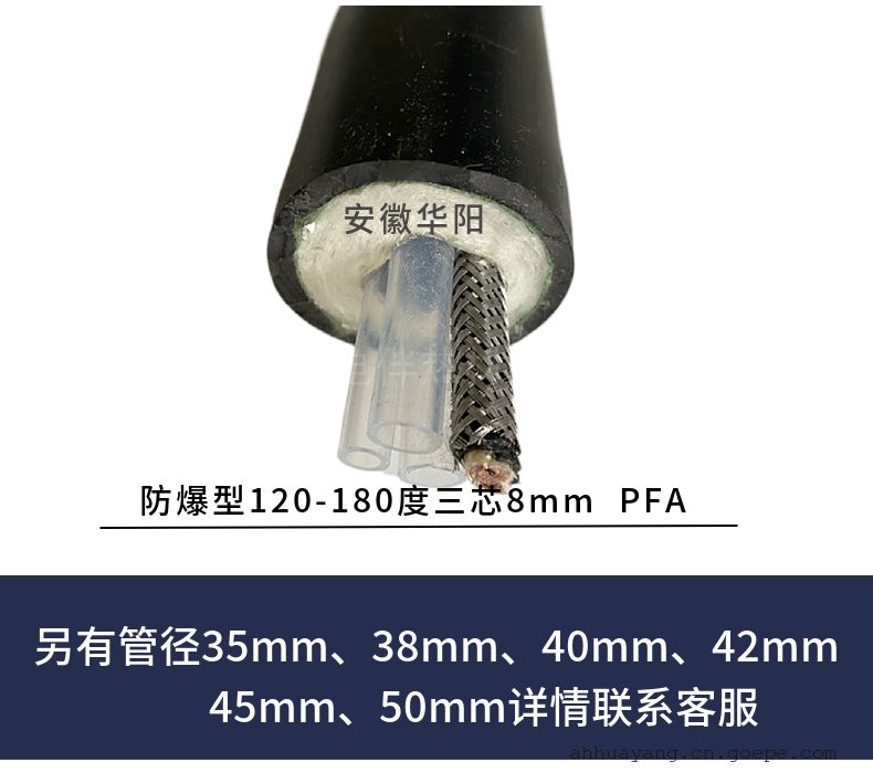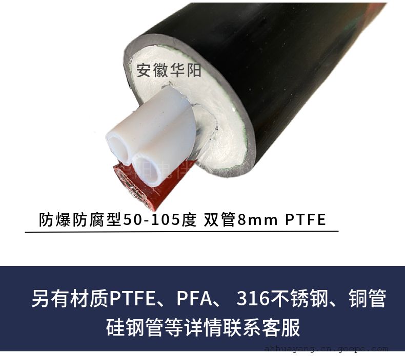 -     详细信息华阳恒功率电力企业用伴热管线TH2200/2*F8*6 80m采样管线安徽华阳电伴热材料有限公司面向合肥地区用户推荐伴热管缆,烟气取样管,一体化伴热管缆,伴热采样管线,复合伴热管线,cems伴热采样复合管,烟气防腐伴热管。 1.增强护套:CVC软胶料户外温度:-70℃~70℃耐各种酸、戚介质腐蚀,耐压强度1.0Mpa不泄漏 2.保温层:玻纤棉防火阻燃95g/m3绝热、阻燃质轻 3.金属膜 4.电热带:提供自控温电伴热带,恒功率电伴热带(0-2000 ,所有电伴热带具有防爆认证,安全可使用于工业危险区 5.屏蔽层 6.采样管 一、耐腐伴热采样复合管是由多种器件组合而成的一个复合体,在有限的截面上组合了多个系统。 ◇采样系统:可组合多种类型、材质的采样管:Teflon PFA、FEP、PE、尼龙610、12、铜管、316SS、304SS等。 ◇热工系统:绝热、阻燃和质轻的保温层; 自动限温的伴热电缆或恒功率伴热电缆。 ◇电系统:可配备仪表信号电缆、补偿电缆和控制电缆满足仪表显示监控用。 ◇安全系统:适应不同的工艺条件,将各系统用铝箔或金属丝网屏蔽隔离,达到防火安全,防静电、电磁屏蔽的作用,有的加防水膜和增强阻燃、防紫外线的护套。多元系统的组合,集多功能于一体,使繁杂的工程简捷化。 对于远程工作和系统的远程诊断起到良好的保障作用。 伴热系统使管内气体不冷凝,保持在露点以上测量,故测量精度可以得到,为中央集中控制计算机化创造了条件。增强外护套可以防止交叉和因其它因素的损坏。 二、华阳恒功率电力企业用伴热管线TH2200/2*F8*6 80m采样管线技术参数: 1、管线:材质PTFE;径Φ8mm、Φ6mm可选;多芯。 2、电伴热带:自限温电热带。 3、采样气体加热温度:0℃-180℃。 4、伴热管线外径:OD42mm。 5、黑色PVC。 6、功率:45W/M。 7、供电电源:220VAC 50Hz 220v。 安装细则: 1.电气指标 (1)额定电压:220VAC. (2)自限温管线加热长度100~120m. (3)自限温管线配备断路器,电流值30A. (4)伴热系统一个回路. 2.热工指标 (1)在-20℃环境温度,15m/s风速情况下,管内保持温度40~50℃。 (2)采样管可耐各种酸、碱介质腐蚀,耐压强度1.0Mpa不泄漏。 (3)采样管可在<200℃温度下长期工作。 3.安装指标 (1)复合管的曲率半径0.5m. (2)安装温度-20℃(在-30℃~-40℃时采取适当措施). (3)固定距离:垂直方向2m,水平方向4m.